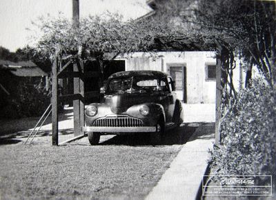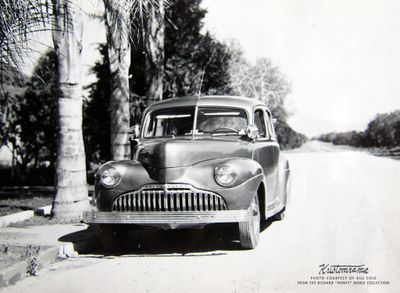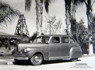 After the war started, Bill worked at an Aircraft defense plant as a machinist and airframe fabricator. In 2019 Richard "Nobey" Noble told Sondre Kvipt of Kustomrama that his friend Bill was a man with many talents. We don't know who performed all of the metalwork on the Ford, but it could have been Bill. The car was mildly restyled, and photos taken around 1950 shows it running a 1946 Buick Roadmaster grille, rippled 1937 DeSoto bumpers, dual spotlights, fenderskirts, and flipper hubcaps with ripples. The bodysides were shaved for trim and handles, and the hood was nosed and molded for a cleaner appearance. The headlights were also frenched. Nobey recalled Bill telling him that the girls loved the car.[1]