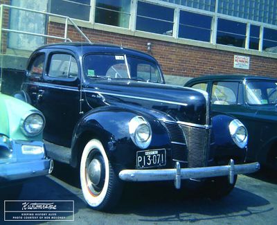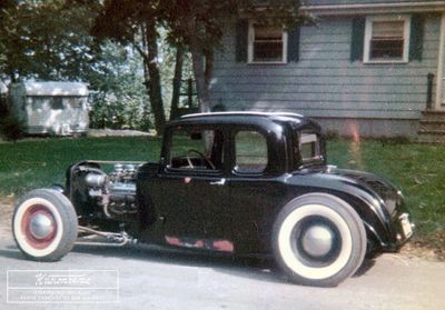 "In the fifties, there were two traditional methods of constructing a hot rod. The West Coast style kept the body up high with a raked or nose down attitude while the East Coast style took it to the ground with no rake." The coupe was torn down, and the body was lifted from the frame. Following the East Coast trend, the body was channeled about seven inches over the frame rails, which had been boxed and fitted with a tubular “K” member. "The rear frame rails were ‘Zd’ and the front cross member replaced with a ‘31 Ford Model unit," Bob told Kustomrama. The stock firewall was removed and replaced with a single piece of 12-gauge flat steel plate welded to the body and frame. The front suspension consisted of a Super Bell chromed 4" dropped tubular axle with 1948 Ford spindles, backing plates, brakes, and drums. The wishbones were split using hairpins custom fabricated from 3/4" thick wall tubing. A 1948 Ford steering box was reversed and rotated 90 degrees, welded to a plate, and connected to a 1940 Ford column topped with a 1956 Chevrolet Corvette steering wheel. A 1948 Ford rear end was shortened and adapted, and plans were made to run a 1957 Chevrolet Corvette small-block engine and a 1948 Lincoln side shifter transmission with overdrive.[1]