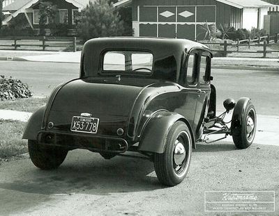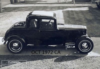 Leaving military service in late 1965, Bob unwrapped the coupe and began a new phase. A Ford F1 rear end replaced the problematic torque-tube setup, raising the rear 11.5 inches. 1932 Ford rear fenders were bobbed and fitted, and the transmission was swapped for a 1950 Mercury open-drive overdrive unit with a 1950 Ford driveshaft that was shortened to connect the two ends. "All four tires were replaced with new 125 MPH Firestone Super Sport 6.70x15’s, front and rear on stock 15” Mercury rims." In June 1966, Bob and his wife relocated to California, towing the ’32 behind their 1959 Buick. Along the way, axle bearings overheated, requiring on-the-road repairs in Durango, Colorado.[1]