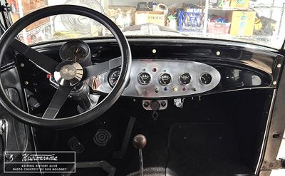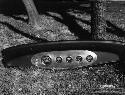 The frame was completed with steel brake lines, a 1948 Ford master cylinder, and a 1953 MG TD emergency brake handle. A 1955 Chevrolet Corvette small-block engine was removed from Bob's 1940 Ford Deluxe Tudor Sedan and installed in the coupe in September 1960. The firewall and frame were painted in black lacquer, and a gas tank from a 1958 MGA was installed along with taillights and a license tag light from a 1953 MG TD. Inside, DKW license plate lights were recessed into the stock ‘32 dash to provide indirect lighting to read the instruments. The inside of the lenses was coated with machine blue dye to tone the lights down and give it the English instrument look. A piece of sheet aluminum was cut into an oval shape and fitted with a SUN tachometer, four Stewart-Warner mechanical gauges, a 1957 Ford Thunderbird ignition switch, and switches and indicators to control the electronics. Early East Coast hot rodder Sebastian "Sabie" Rubbo had been a close friend of Bob since 1952, when he first met him at the age of 12 at Nantasket Beach in Hull, Massachusetss, and he was Bob's mentor during the build. According to Bob, Sabie knew many garage locations and buildings throughout New England where hot rods were built, and he visited them regularly, sharing his knowledge. "Sabie went to one of those many local places he visited and picked some aluminum metal out of their scrap pile for me, which became the dash oval center section," Bob recalled in 2025.[1]