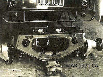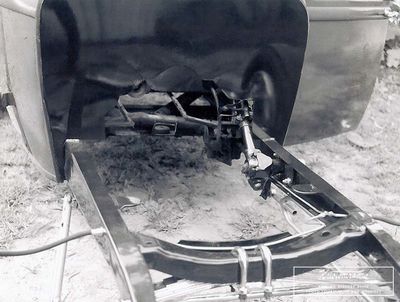 Dietz headlights were mounted on handmade aluminum brackets to compensate for frame twist. "These were filed, sanded and polished. When completed and installed, both headlights aligned perfectly with their centers 24 ½ inches above the ground. An Aluminum bar strap was added under the brackets to the frame bottoms forming a triangle to eliminate headlight vibration." The grille shell was sectioned three inches, and a modified 1952 DeSoto radiator was adapted. In September 1960, the car was drivable under its own power.[1]