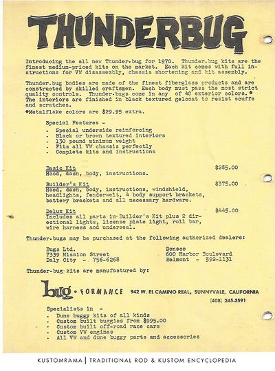 Bugformance Inc. was an influential American automotive company specializing in the manufacturing of dune buggies, particularly known for its iconic Thunderbug dune buggy model. Founded in the late 1960s in Sunnyvale, Northern California, by Tony Vierra and Clay Diekmann, Bugformance Inc. played a pivotal role in the evolution and popularization of dune buggies in the United States.[1]