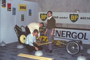 Various pipes of varying quality (!) were procured in different places and an intensive welding and tinkering started. First, a Ford side-valve V8 was tested into the frame, but was replaced by an engine from Oldsmobile. The car was shown under construction in the Marmorhallarna "Sportvagnen & Vi" in 1963 together with some English dragsters.