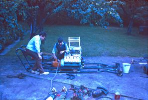 After this, the car was taken down and the chassis and engine painted red. The dragster was prepared and the first test drives were made on the roads within the Enskede field and around Vårflodsparken(!). Strangely enough, the neighbors didn't call the police, one must assume that they were quite hardened by now.
