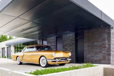 Ina Mae handed over her ideas to Neil Emory and Clayton Jensen. Ina had drawn the car to scale. The three piece rear window was replaced by a one piece 1953 Lincoln unit. The emblems and chrome ornamentations on the hood and fenders were removed for a cleaner appearance. The lower bumper was recessed three inches and painted in the same color as the car. A Kaiser grille guard was added to the upper front bumper. The vertically chrome moldings on the rear quarter panels were removed. The holes from the moldings were not filled, instead Neil Emory fabricated new moldings from 1952 Ford backup light bezels to simulate air scoops. Ina also wanted to have a continental kit installed on her car, and Neil and Clayton extended the rear fenders 12 inches to cover up the continental spare tire cover from the sides. The rear bumper was narrowed three inches due to the body tapers inward at the rear. The Lincoln inscription on the license guard was pounded out, giving the guard a simpler look. A new license light bracket was made which was placed on the bumper instead of the continental kit. The eight exhaust pipes were routed through the simulated air scoops in the rear fenders. Modified 1951 Lincoln wheel covers were installed. The hubcaps were modified by attaching aluminum saucepans with 1953 Lincoln medallions. The car was originally painted two tone yellow. After the restyling it was repainted Buick Mandarin red with Nash Ambassador gold top. The interior was done in black and red leather.[6]