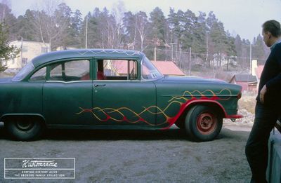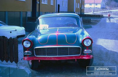 Kent Olof Olsson's 1955 Chevrolet was a mildly customized and flame-painted sedan from Johanneshov, Stockholm, Sweden. The car was a familiar sight around Vendelsö in the early 1960s and stands as a good example of how young Swedish enthusiasts interpreted the growing American hot rod and custom trend at the time.