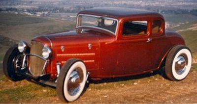1932 Ford 5 Window Coupe owned by Hutters car club member Lynn Yakel of Montebello, California. Lynn's coupe was chopped 3 1/2 inches and channeled 6 inches over the frame. The stock grille and radiator were sectioned in order to fit the lowered body. For a cleaner appearance, the body had the cowl vent, shell and deck lid molded in place.[3] The roof was filled using a steel plate. Whitey Clayton of Clayton Metal Shop made a 3-piece aluminum hood with 132 louvers punched into it for Lynn's coupe.[4] In addition to this, he also reworked the side moldings on the car so that stopped just short of the hood side panel separation. Yakel's coupe was done about the same time as Bill NieKamp's 1929 Ford Model A Roadster, and Lynn remembers seeing Bill's roadster under construction in Whitey's shop.[5] Up front the coupe sported a fully chromed and dropped 1932 Ford axle. Tubular shocks were mounted on special spring shackles. A Halibrand Quick Change gear box was mounted in the rear. The 3.78 gears were reduced to a 3.19 final drive ratio intended for street use. The center section of the Halibrand Quick Change was chopped to fit the '32 frame and bolted to a special tubular cross-member. The rear spring was lengthened and re-arched to clear the other components. The 1946 Ford wheels[3] were pressed out 1/4 inch in order to clear the body. The stock brakes were replaced by hydraulic binders from a newer model.[6] Kenny Smith did most of the body and chassis work on Lynn's coupe.[4]