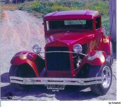 Ford Model A Pickup restyled by Joe Crisafulli for Tom Brewer. Joe restyled the car in 1976. Tom wanted the car red with a flame paint job, and Joe hand applied real gold leaf flames as used on picture frames. The truck was painted it in Joe's chicken coop. At the time he was living in Almaden, California, an old quicksilver mining town. The three rom house he was living in was an old miners cabin that had a large chicken coop in the backyard. There were no chickens in the booth at the time, and it was cleaned up when the truck was painted.[1]