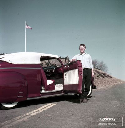 1948 Mercury owned and restyled by Tom Piantkoski of New Jersey. Tom was a body man at Highland Auto Body and one time owned a customized 1941 Mercury Convertible. He spent $1200 to customize the car and its main feature was a 4 1/2 inch chopped top which went up and down like a normal convertible top. During a pleasure trip to California in the early 1950's Tom was involved in a traffic accident in Zanesville, Ohio and his Mercury was totaled. Tom continued his trip by bus, and ended up in Los Angeles where he managed to get a job as an machinist. One day, on his way to work, he saw an uncompleted 1948 Mercury custom for sale. The asking price was $1100, so Tom bought it right away. The newly purchased Mercury had already been chopped 5 1/2 inches and was fit with a padded top by Carson Top Shop. The car was nosed and decked as well.[2]